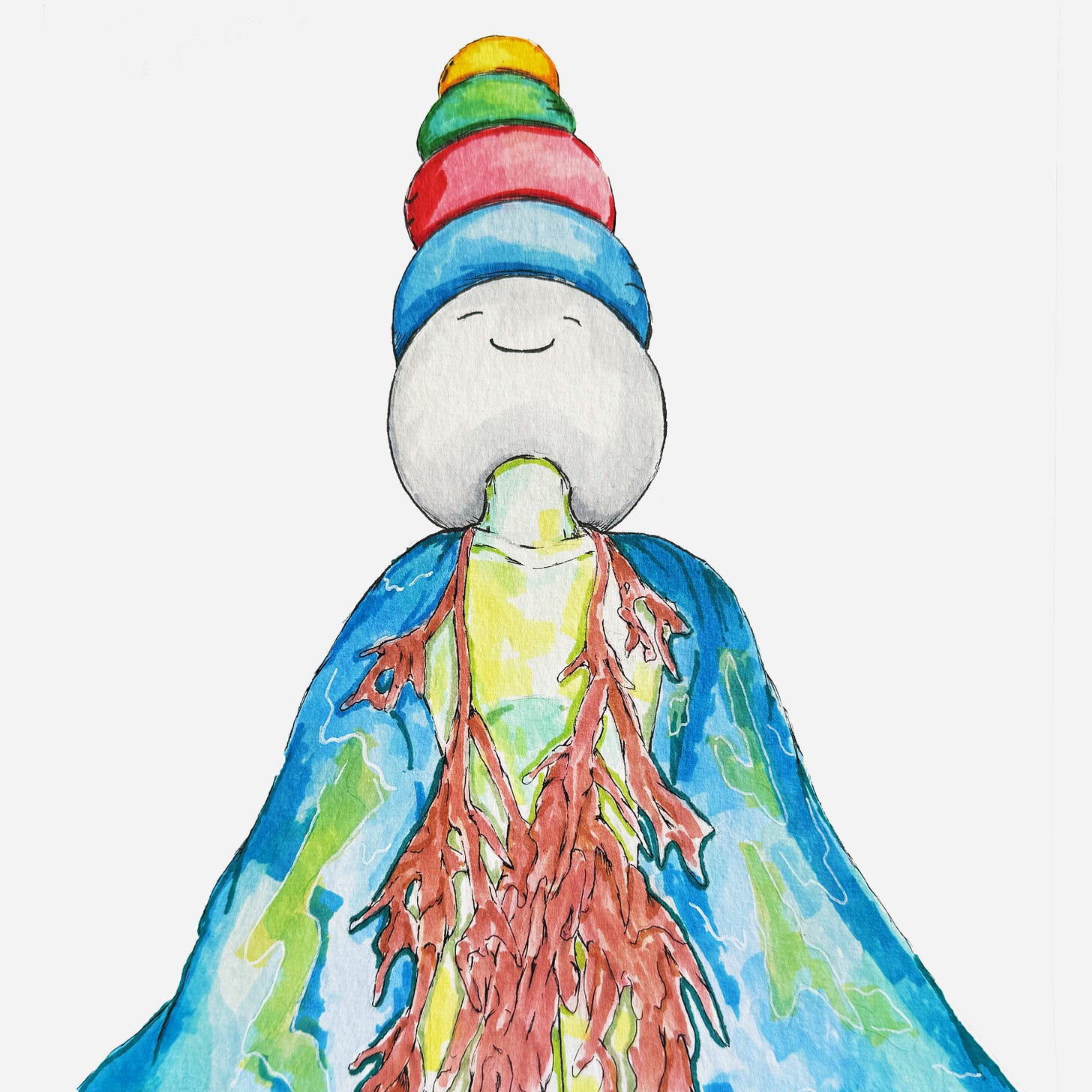 Siya wears a cape made of moving water and a coral necklace as an accessory. If she has one, her face is hidden by a white mask made from oyster shells, with four similar masks stacked on top. Each mask is in one of the ocean colours with a painted expression. They are constantly rotating, with Siya’s current state facing the front. Like most of the seed-born demigods, Siya does not speak. That’s about as far as the similarities go, as she has never created any creatures and cares nothing for them. They are not her priority. The only creatures she ever showed any attachment to are the Aquarians and Bomblo because of her love for seashells.