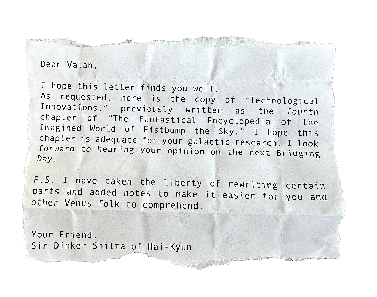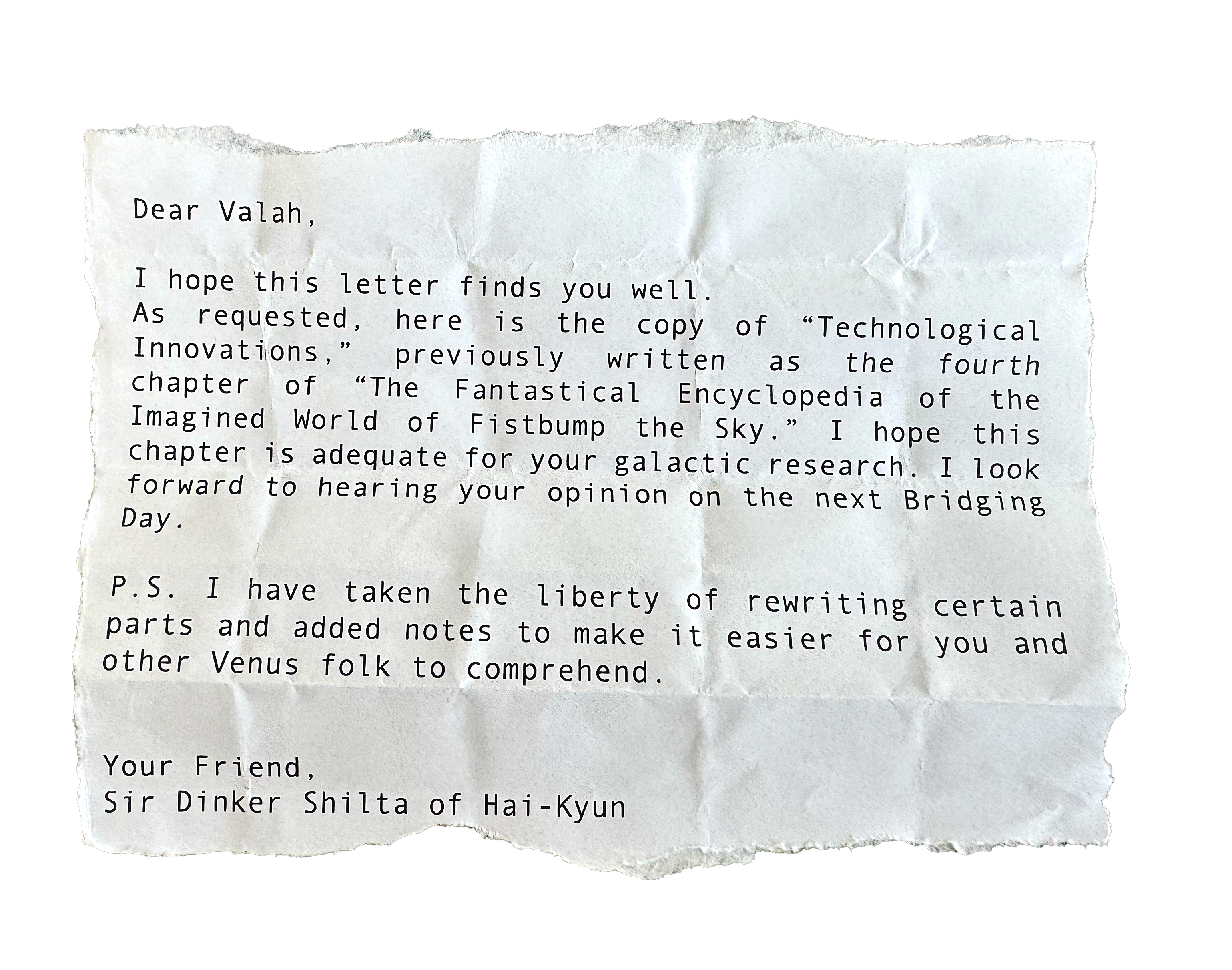 The Interterritory Research Team, myself included, have been tasked with cataloguing and describing the many fascinating inventions of Fistbump the Sky in such a manner that beings from other planets could understand how they work. Such a request is, of course, absurd. While inhabitants of planets such as Venus, Spot, and Pluto have the luxury of creating inventions through trial and error, our planet, on the other hand, has gone out of its way to interfere with our progress. It is also nearly impossible to list every invention in a single chapter or to create a list based on any specific time period, as each territory naturally possesses its own timeline.