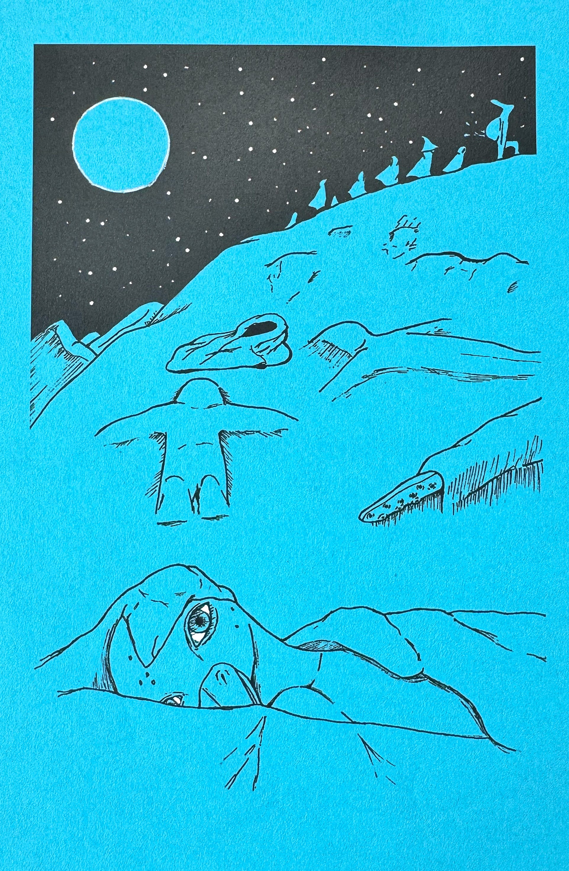 The distraught frog scraped the mess together, trying to save whatever he could. Sadly, he was unable to separate the botanical seeds from the cracked eggs and flour, resulting in a strange dough instead, which hardened into a deformed cake. The imprints of his hands created mountains and rivers, reshaping the cake’s surface into a habitable world. The frog’s blood ran cold. Not only had he accidentally created a world, but also creatures that sprouted from the embedded seeds. Each was a confirmation that his carefree life was about to change.